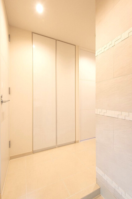 廊下は玄関から右に伸び、戸口から室内の様子が見えないようになっています。宅配やフードデリバリーなどを使う機会も増えているので、プライベート空間が見えにくい造りはとてもありがたいですね。廊下には物入を設置。日常品のストックを収納するのに便利です。