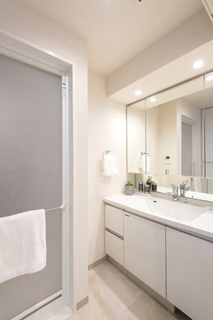 こちらが洗面室です。シームレスの洗面ボウルは汚れが溜まりやすい部分がほとんどないので、かなりお掃除がしやすくておススメです。