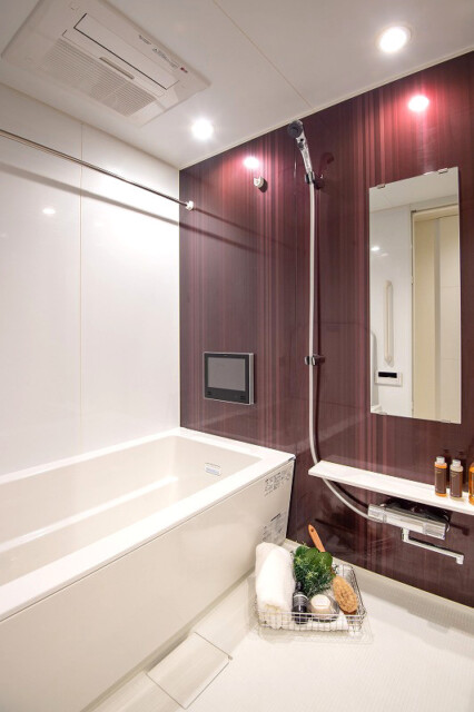 浴室です。ワインレッドのアクセントパネルが輝いていますね