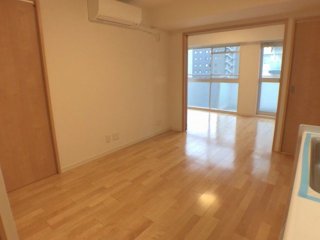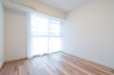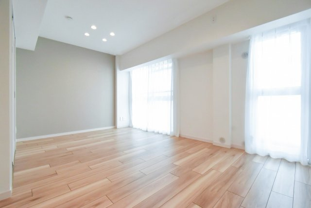 西向きのバルコニーに面したお部屋です。フローリングに白のクロスのナチュラルテイスト。アクセントにも合わせやすいグレーを使っていて、カーテンや家具などを幅広く選べそうですね。
