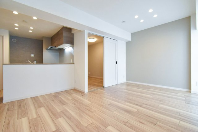 こちらは約12.2帖のLDKのリビング・ダイニング部分。キッチンがL字型のLDKの出っ張った部分にあり、残りの西向き窓に面した四角いスペースをまるまるリビング・ダイニングとして使えるようになっています。レイアウトの自由度が高いのでいろいろ考えるのも楽しそうですね。