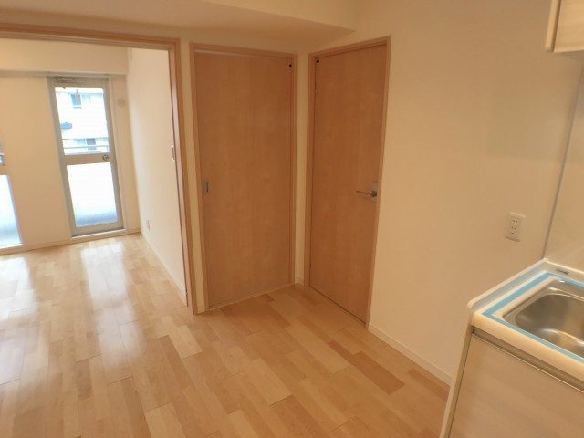 廊下からお部屋に入ってまず正面に目に入るのがキッチン。場所をとらない壁付けタイプで、フローリングに合わせた木目パネルを使用しお部屋の雰囲気にもよくマッチしています。水栓には浄水機能が付いているのでお茶やお料理に気軽に使っていきましょう!