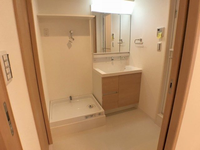 洗面室には洗面化粧台の他に洗濯機スペースと浴室がまとまっていて脱衣室も兼ねています。洗面化粧台は身だしなみを整えるのに便利な三面鏡付き。上部に照明も付いているので影になって見づらいなんてこともありません。洗濯機スペースには棚が設置されているので洗濯洗剤などのランドリー用品はこちらへどうぞ。