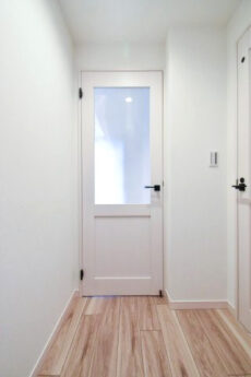 廊下は短いながら幅があってゆったりとした印象です。廊下というよりホールといった方がしっくりくるかもしれません。右側のドアを開けるとトイレになっています。もちろん洗浄機能付き!トイレットペーパーのストックや掃除道具の収納に便利な吊り戸棚も付いています。