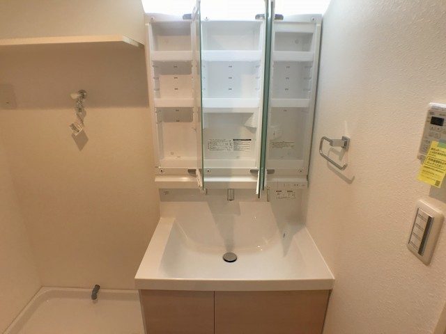 歯ブラシや基礎化粧品などの小物はミラーの内部、掃除用具などは開き戸の中、タオルなどは引き出しとしっかりと住み分けが出来るかと思います。