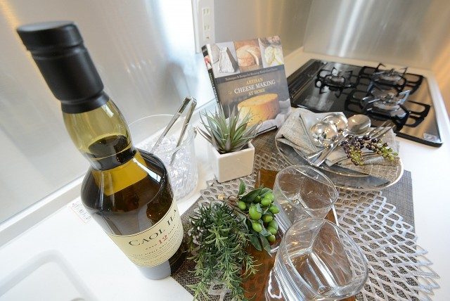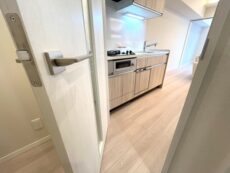 キッチンは壁付けタイプ。場所をとらずにお部屋を広く使えるのが特徴です。キッチン内が目立つのでなるべくキレイにしておきましょう。