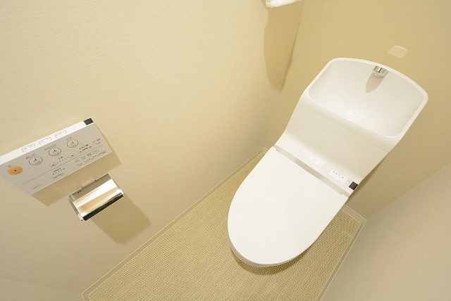 ・トイレットペーパーや掃除道具などの収納に便利な吊り戸棚も付いています。