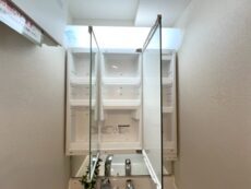洗面化粧台の三面鏡裏はキャビネットになっていて、洗面周りに散らかりがちな細々したものもスッキリと片付けることができます。洗濯関係の物は洗濯機スペースの棚へどうぞ。ちなみに、棚の下に付けられたハンガーを掛けられるようなポール、個人的には高ポイントです♪