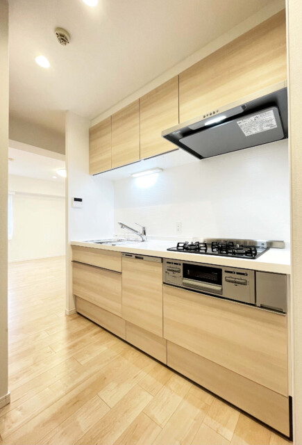 間取り図ではLDKとなっているものの奥まった所にあるほぼ独立したキッチンです。最近は開放的なカウンターキッチンが増えていますが、生活感たっぷりのキッチンが目立たない独立型にも根強い人気があります。みんなの憧れ食器洗浄乾燥機付き!!!