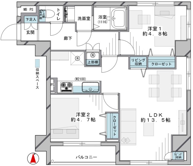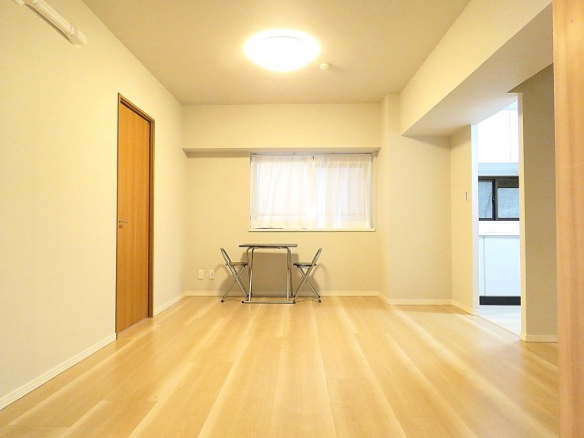 南・東の二面採光のお部屋です。L字の出っ張った部分にキッチンを配し四角いスペースをリビングダイニングとして使えるようになっています。柱などの凸凹が多少ありますが、そこにピタリとはまるようなレイアウトを考えるのもまた楽しそうですね。