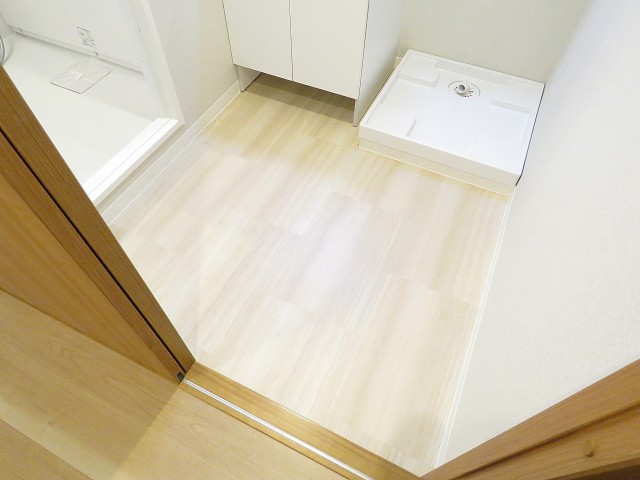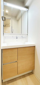 隣は洗面室。洗面化粧台と浴室がまとまっていて脱衣スペースを兼ねています。洗面化粧台は身だしなみチェックに便利な三面鏡付。裏がキャビネットになっているので、洗面周りの細々したものもスッキリと片付けることができますよ。洗面室に置くことが多い洗濯機ですが・・・廊下に個室をもらっていました!(笑)