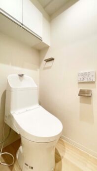 廊下最初のドアはトイレです。TOTO製のウォシュレット一体型。トイレットペーパーのストックや掃除道具の収納に便利な吊り戸棚も付いています。