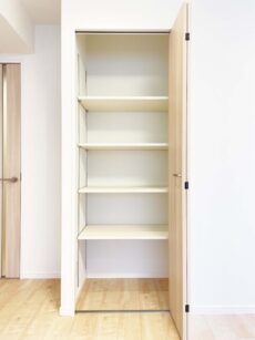 お部屋の中央辺りと南向き窓際にリビング収納が二つ!奥行きがあって、日用品や食品のストックからリビングに散らかるものまでいろいろと入れておけそうですね。棚を調整すれば無駄なく詰め込むことができますよ。