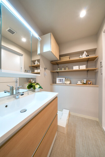 棚にはリネン類が置け、洗面化粧台も十分な収納力ですね