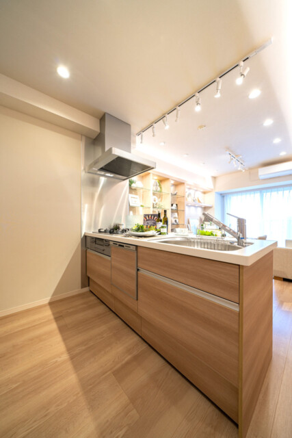 リビングとの一体感を出すため上段の収納が対面式キッチンにはありません