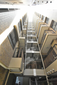 左右を建物に挟まれているので、中央部分を吹き抜けにして採光や風通しを確保しています。