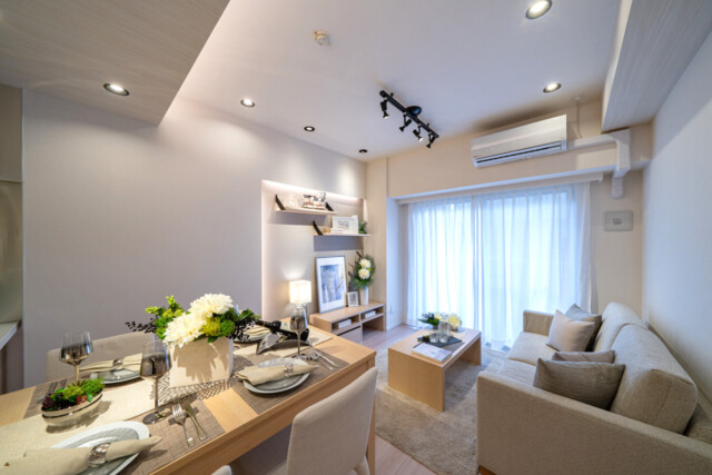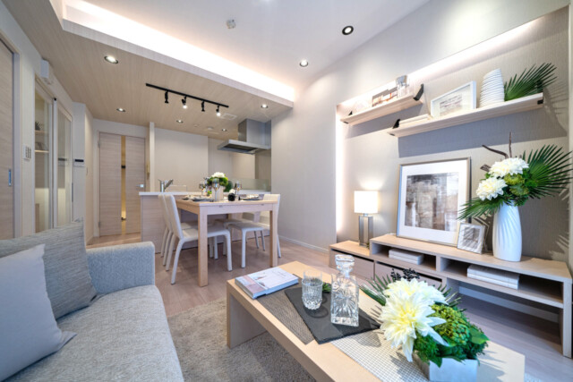 壁や天井の段差に間接照明を設置して立体感のある空間を演出しています。色使いがシンプルなのでダウンライトやスポットライトを使ってアクセントをつけているのもセンスがいいですね。