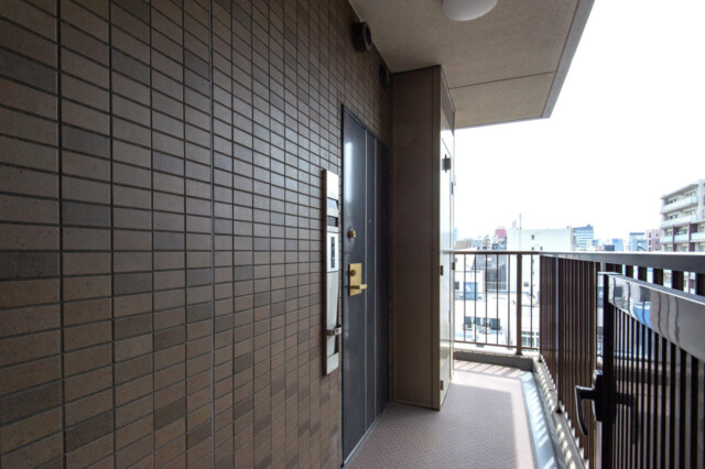 エレベーターを9階で降りて外廊下を進むと、突き当りが扉の付いた玄関ポーチになっています。共有部なので本当はダメなんですけど、瞬間、何かを置いておいたりできて便利ですよね。玄関前を人が通ることもないのでプライバシー的にもGOOD!