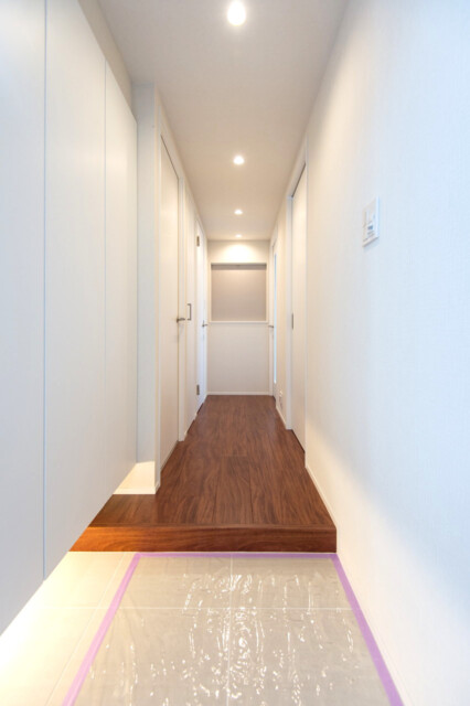 玄関から伸びた廊下は突き当りにドアがなく、戸口から室内が見えづらいタイプ。宅急便やフードデリバリーなどを使う機会が増え、知らない人が訪ねてくることも多い今の時代、これはありがたいですね。人感センサー付きなのでいつでも明るいお部屋が迎えてくれますよ。