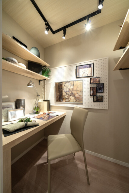 机や棚が造り付けになった秘密基地のようなお部屋です♬ テレワークにぴったりで、これなら会議の度に部屋を片付ける必要もありませんね。ホビールームとして使う時は棚は飾り棚として使えそうです。天井にダクトレールが設置されているので、コレクションを照らすライトは数や位置が簡単に変えられますよ。