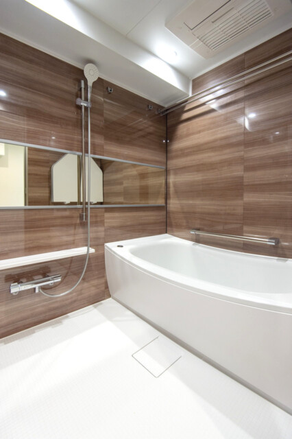 ダークブラウンの木目パネルを使用した浴室は落ち着いた雰囲気。リラックスしたバスタイムを過ごすのにぴったりですね。便利な追い焚き機能や、雨の続く季節に嬉しい浴室換気乾燥機能付き!