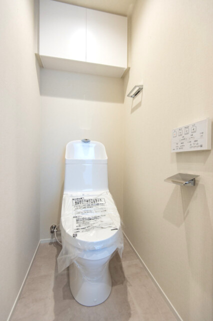 トイレはTOTO製の洗浄機能付き。トイレットペーパーや掃除道具を入れておくのに便利な吊戸棚もいています。