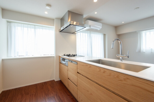 開放的なところが人気のキッチンですが、窓があることによってさらに開放感がアップしています。お洒落なグースネックの水栓がフラットトップに映えていますね。洗い物は食器洗浄乾燥機にお任せして、食後は家族団らんのんびり過ごしましょう♬