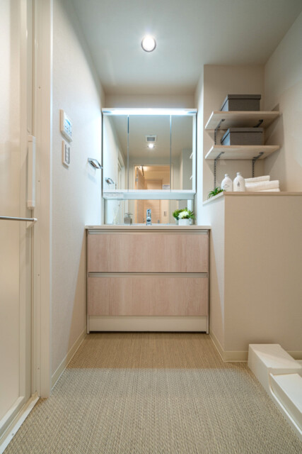 洗面室には洗面台の他に洗濯機スペースと浴室が付いていて、脱衣所も兼ねています。洗面台横の収納棚には、リネンや洗濯洗剤などいろいろなものが置けて便利そうですね。洗面台は三面鏡付で身だしなみのチェックも楽々。洗面台自体に照明が付いているので影になることもありませんよ。
