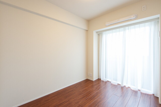 バルコニーに面した大きな窓があるお部屋です。入口に引き戸使用でデッドスペースがなかったり、ウォークインクローゼット付きで収納家具を置く必要がなかったりと、かなり自由にお部屋を作っていくことが出来ます。