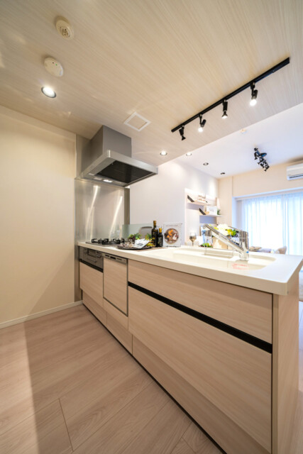 建具と揃いの木目の調理台には、食器洗浄乾燥機や浄水機能一体水栓など便利機能も満載!食洗機に洗い物を任せれば、食後の時間もみんなとのんびり過ごせますね♬ 素敵な天井を汚さないためにも調理中は換気扇をお忘れなく!