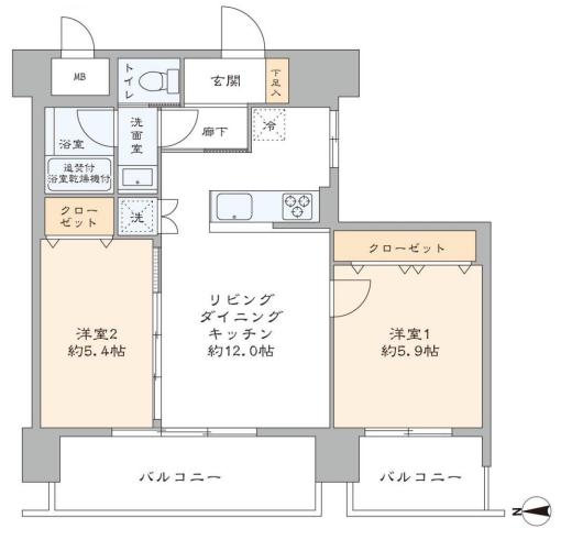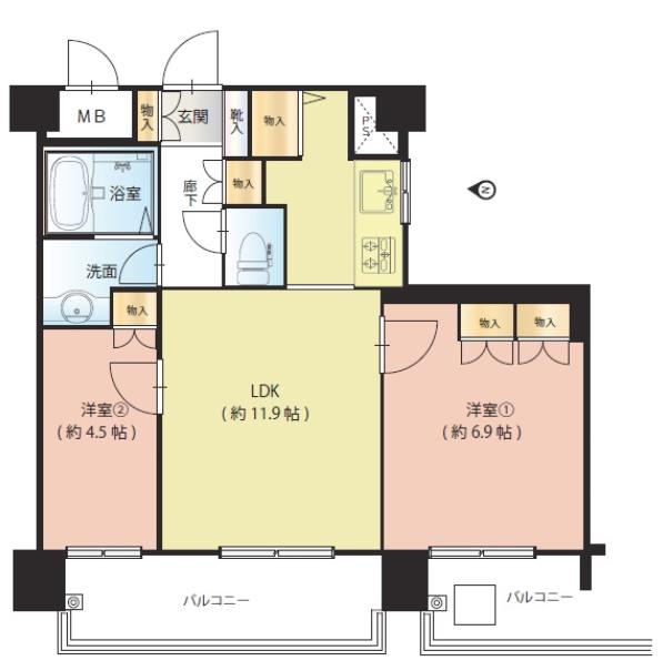 洋室はリビングダイニングを中心として左右に隣接しています。