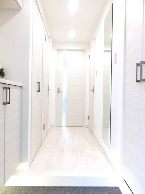 玄関をあがるとコンパクトな廊下があり、洗面室とLDKの扉が並んでいます。
