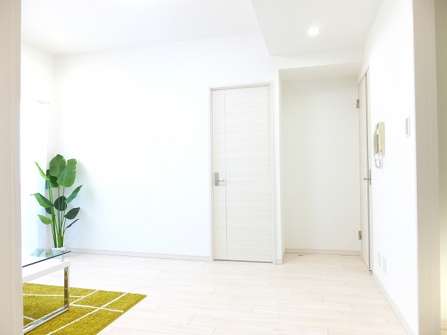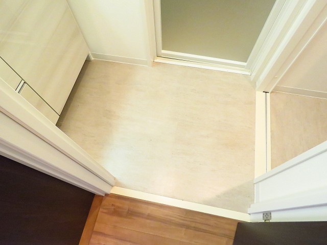 右側に洗面室、左側に物入れ、トイレ、正面にLDKの扉が設置されています。