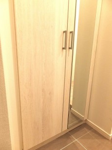 白と木目を基調とした明るい室内。 玄関横にはたっぷり収納できるトールサイズのシューズBOXが設置されています。棚の高さを調節すればブーツや長靴などもお仕舞いただけます。
