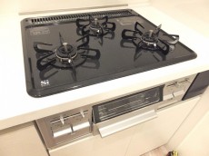 3口ガスコンログリル付き。最初からフライ返しがついていますね (*^艸^)