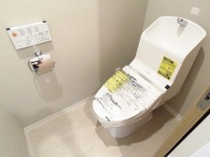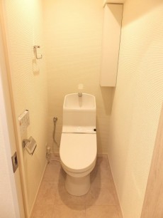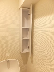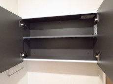トイレはウォシュレット付き。ペーパーのストックや掃除用具の保管に便利な吊戸棚もついています。