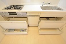 キッチンもフローリングにあわせて木目柄。お料理がはかどる3口ガスコンロ、浄水機能付き水栓、人造大理石トップとスペック◎。大割りのスライド収納も物の出し入れがしやすく使い勝手がよさそうです。