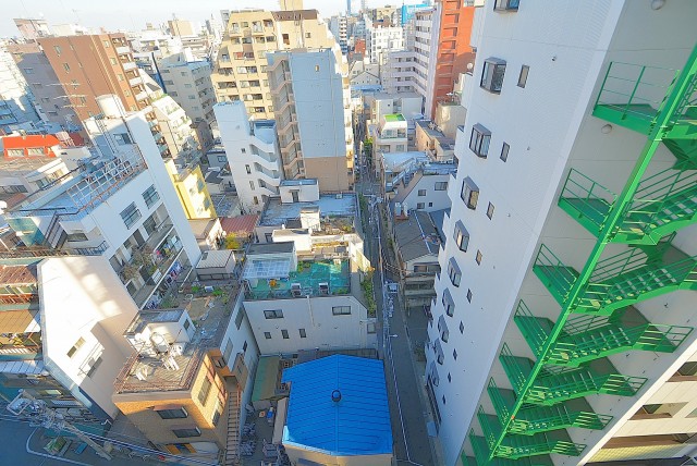 バルコニーはどちらの洋室からも出られます。3階なので、パノラマビューとはいきませんが、目の前に下町情緒たっぷりな路地が伸びていました。こんな眺望も一つの楽しみ方かな、と思います。