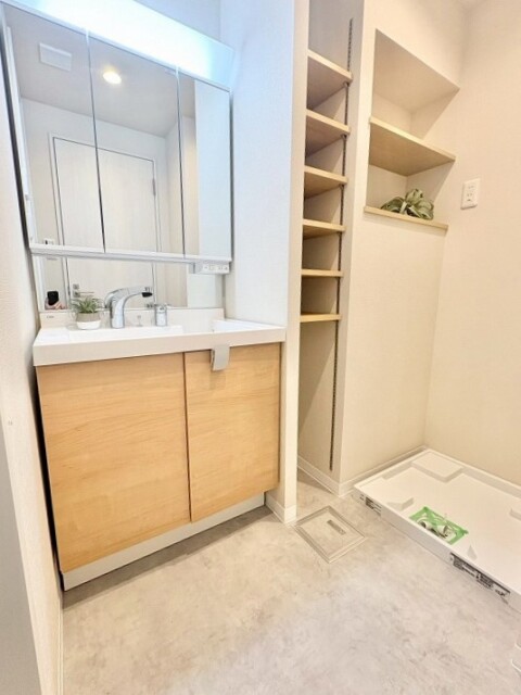 【洗面室:三面鏡付き洗面台・洗濯機スペース・リネン棚】