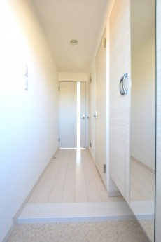 扉を開けると、白で統一された清潔感のある玄関♬照明は人感センサー機能付ですので、玄関を開ければパッと照明がつきます。