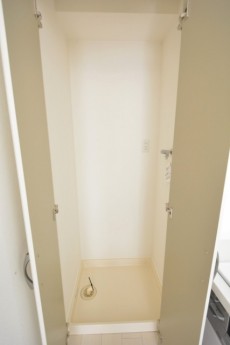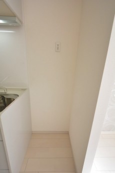 冷蔵庫の奥が、洗濯機置場です☆しっかりと扉がついていますので、生活感を隠すことができて助かります(*´∀`*)棚等は設置されていませんので、後から棚を設置したり、突っ張り棒で収納を作ったりと工夫したいですね。