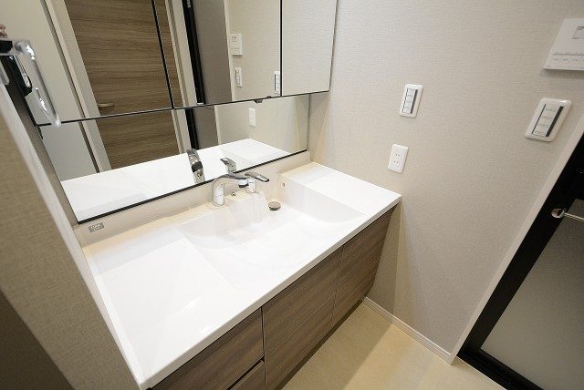 【洗面室:三面鏡付き洗面化粧台・洗濯機スペース】