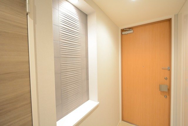 【玄関:高級感のあるタイル貼り・人感センサー付き照明】