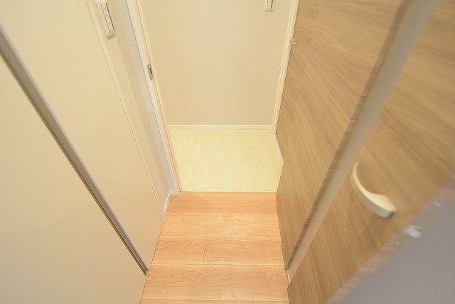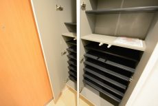 右手にはシューズボックスが見えます。中の棚の高さは自由に変える事が出来るので、ブーツなどの背の高い履物でも収納することが出来ます ( ゚ω^ )ゝ