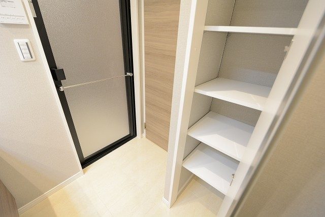 浴室の前にも棚があります。タオルなどはこちらでも良いかもしれませんね。