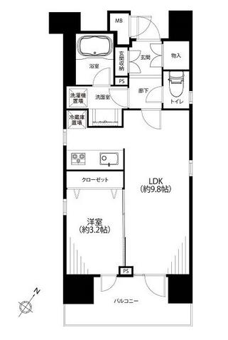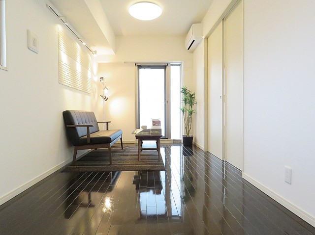 LDKは約9.8帖。縦に細長い空間です。エアコンも設置されており引っ越したその日から快適にお過ごしいただけます。