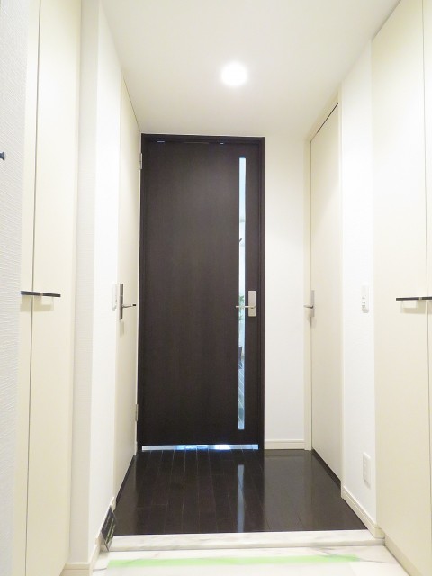 白基調の明るい玄関ホール。人感センサーがついており人の気配で照明が自動で消灯します。消し忘れもなく経済的。インターホンは来訪者の顔が確認できるTVモニター付です。