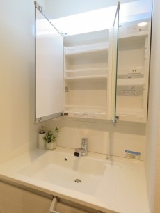 洗面台は三面鏡付き。上部の照明のおかげでで鏡を使う時に影になったりもしません。