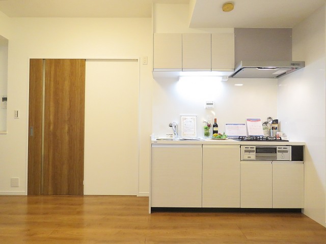キッチンは壁付けタイプ。スペースをとらずお部屋を広く使えるというメリットがありますが、キッチン内が丸見えというデメリットもあります。綺麗にしておけばなんの問題も無いんですけどね^^;)