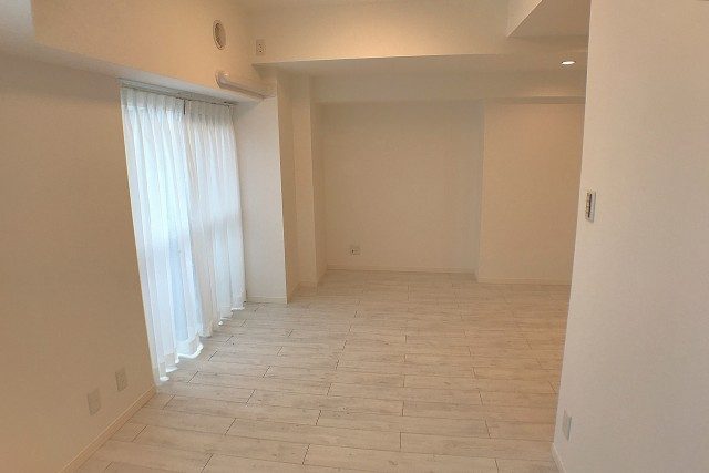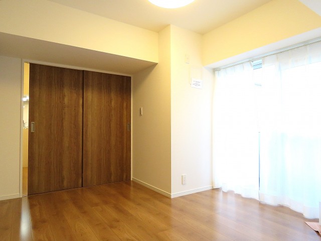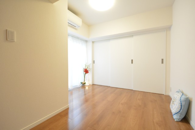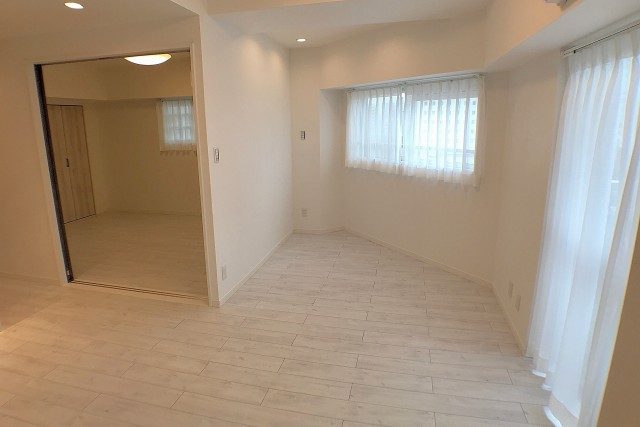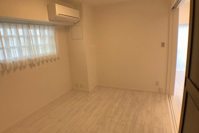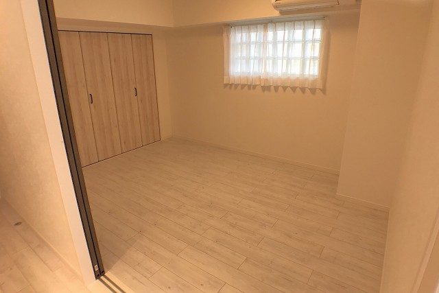 こちらは約4.8帖の洋室。バルコニーに面した窓があるお部屋です。柱があってL字型になっていますが、この広さがあればベッドを置いたりには問題なさそうですね。入口も引き戸なのでデッドスペースも出来ません。無駄なくスペースを使う事が出来ます。